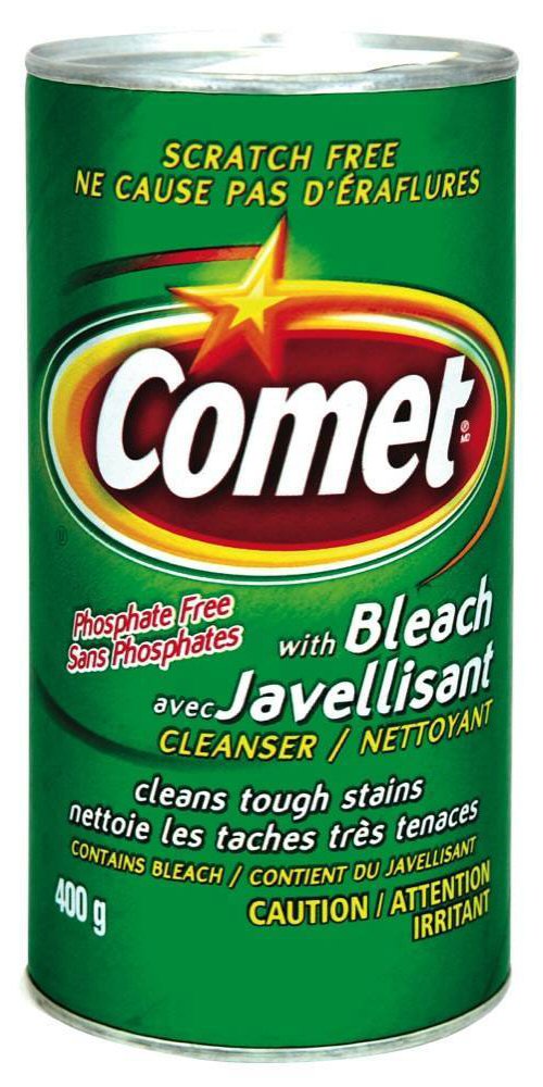 Comet or any generic or store brand powdered cleanser. I use this exclusively on hard-to-clean toilet bowls (such as rust and other set-in stains). It may say it doesn’t scratch, but I don’t believe that, and would never use it on anything that might scratch.