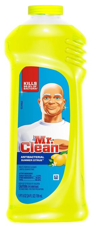 I use Mr Clean (or equivalent) in the bathrooms. Believe me, that’s strong enough for most jobs. If there is a mildew problem I will request that you purchase a bleach-based cleaner (I like 30 Seconds with the yellow label) to obliterate the stains, but otherwise no, I won’t use bleach. The fumes are just too debilitating and dangerous.