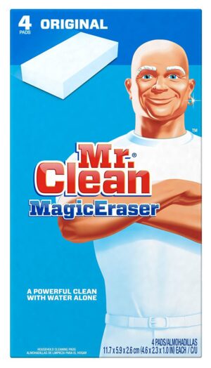 Magic Eraser or any generic or store brand. (I have found boxes of two “Quick Erasers” at DollarTree that do the trick.)