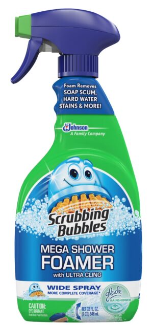Scrubbing Bubbles Mega Shower Foamer, in the can, works best, as it covers a large area quickly. I believe it uses less product per cleaning than the trigger spray version. Either one works very well, though.